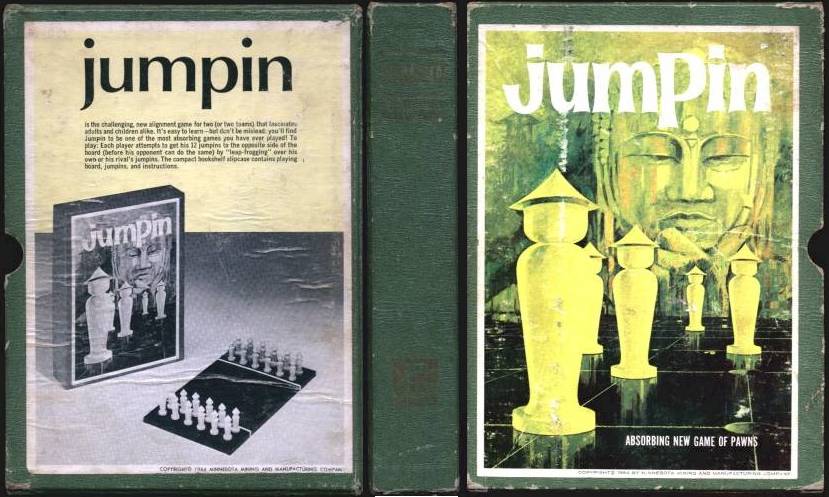 The compact bookshelf slipcase contains playing board, jumpins, and
